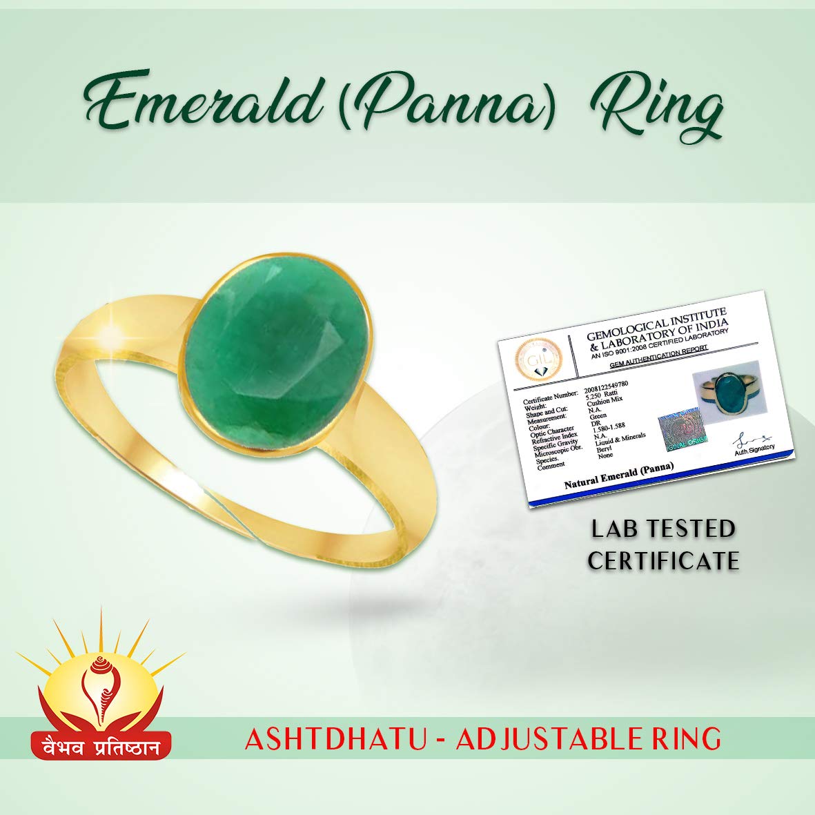 Vaibhav Pratisthan: Natural Certified 4.8 Carat (5.25 Ratti) Emerald Panna Gemstone Studded in Ashtdhatu Adjustable Ring with Lab Tested Certificate